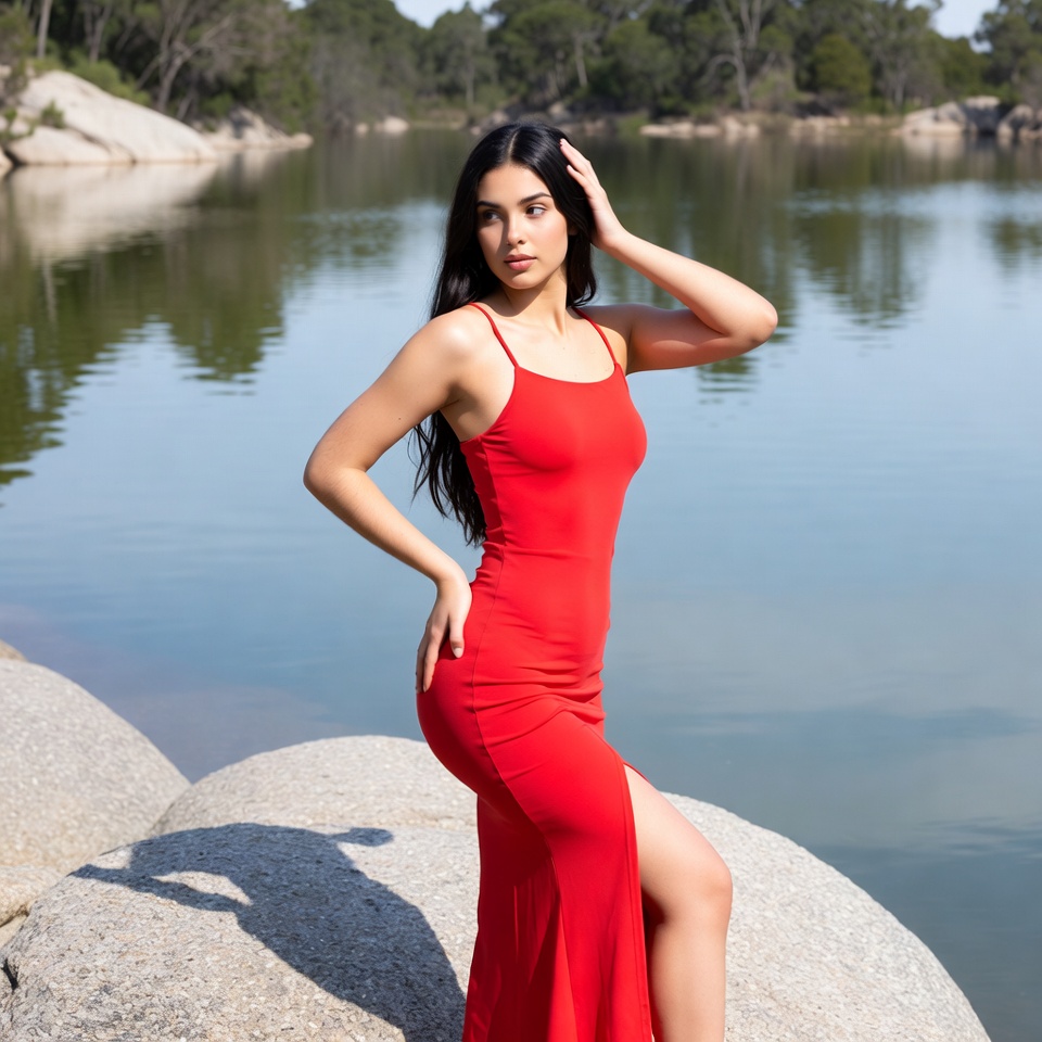 A young woman with long dark hair stands on rocks by a calm lake surrounded by trees. She wears a form-fitting red spaghetti-strap dress with a high slit and poses with one hand on her head and the other on her hip. Sunlight casts shadows on the boulders behind her.