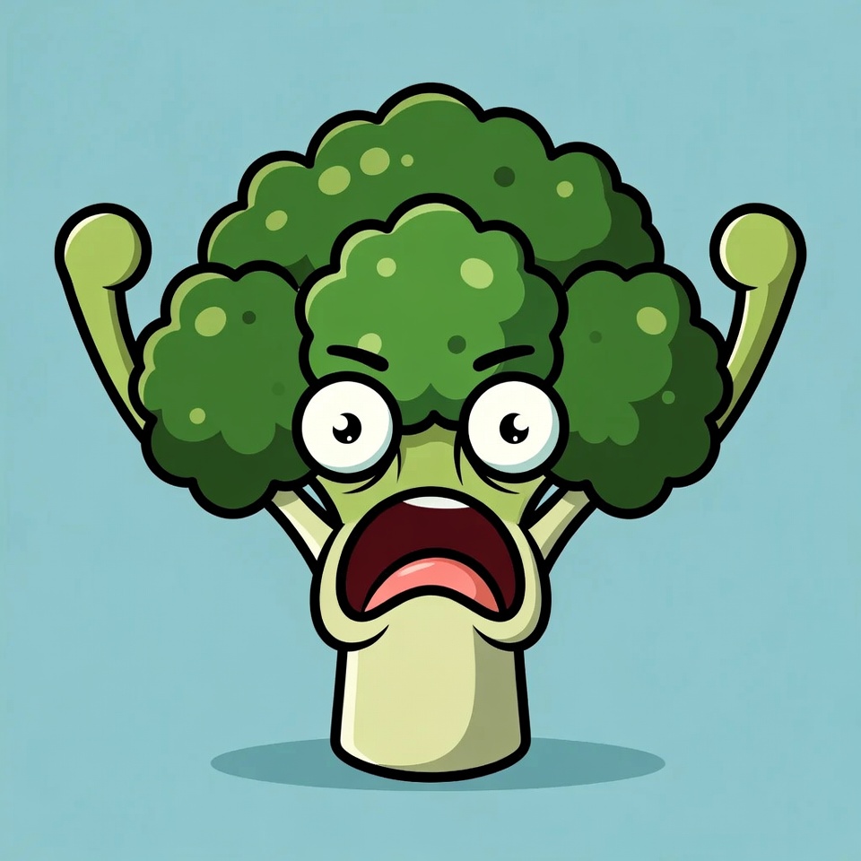A cartoon broccoli with wide eyes, an open screaming mouth, and angry expression flexes its muscular arms. The vibrant green vegetable stands on a light stem against a blue background. The illustration features bold outlines and exaggerated features.