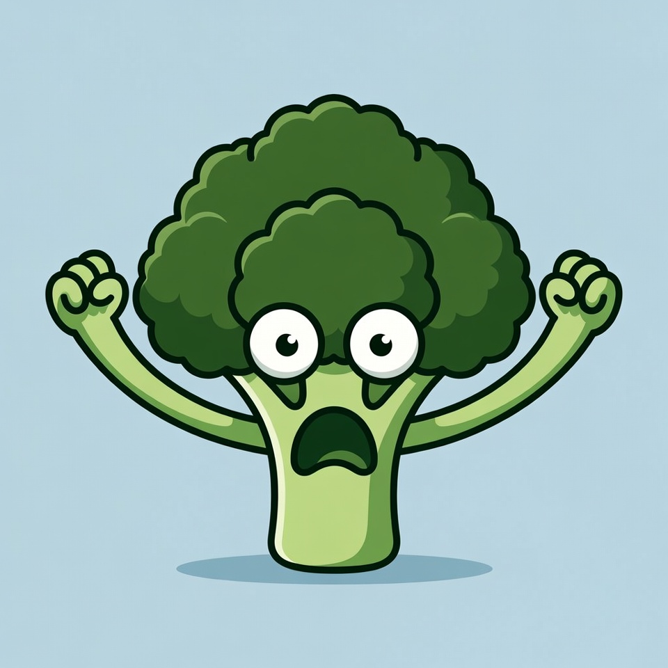 A cartoon broccoli character stands on a light blue background with wide eyes and an open screaming mouth. Its green floret head features a surprised and fearful face. The broccoli has green arms raised with clenched fists.