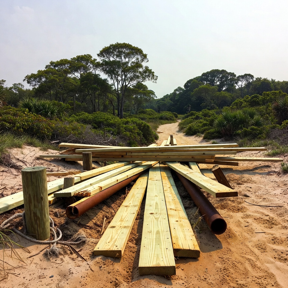 A pile of wooden planks, posts, and red pipes lies scattered on a sandy path surrounded by beach dunes. Tall pines and palmettos line the trail under a hazy sky. Rope is tangled among the construction debris in the coastal setting.