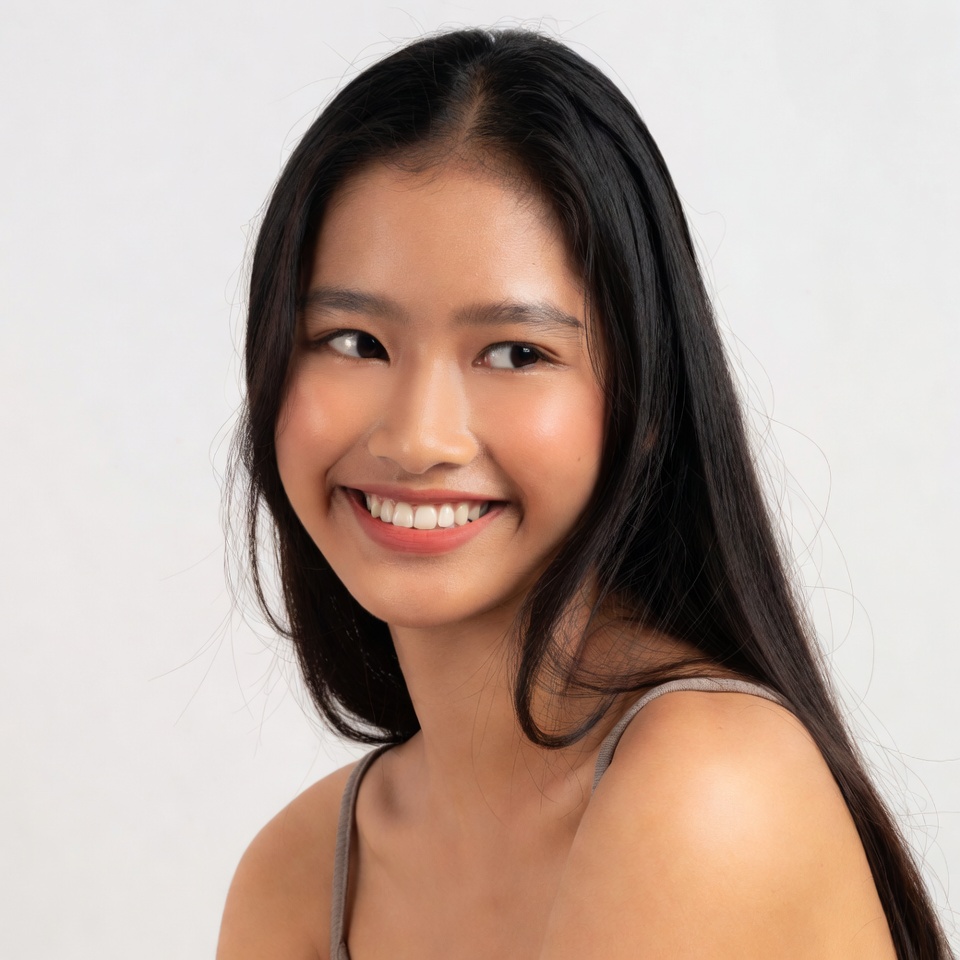 A young Asian woman with straight long black hair smiles warmly at the camera. She has almond-shaped eyes, smooth skin, and wears a thin strap top. The portrait is set against a plain white background.