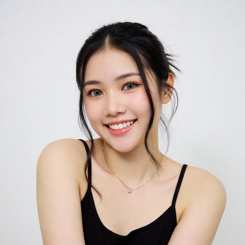 A young Asian woman with long black hair tied in a loose updo smiles warmly at the camera. She wears a black spaghetti strap camisole and a delicate necklace with a pearl pendant. Her shoulders are visible against a plain white background.
