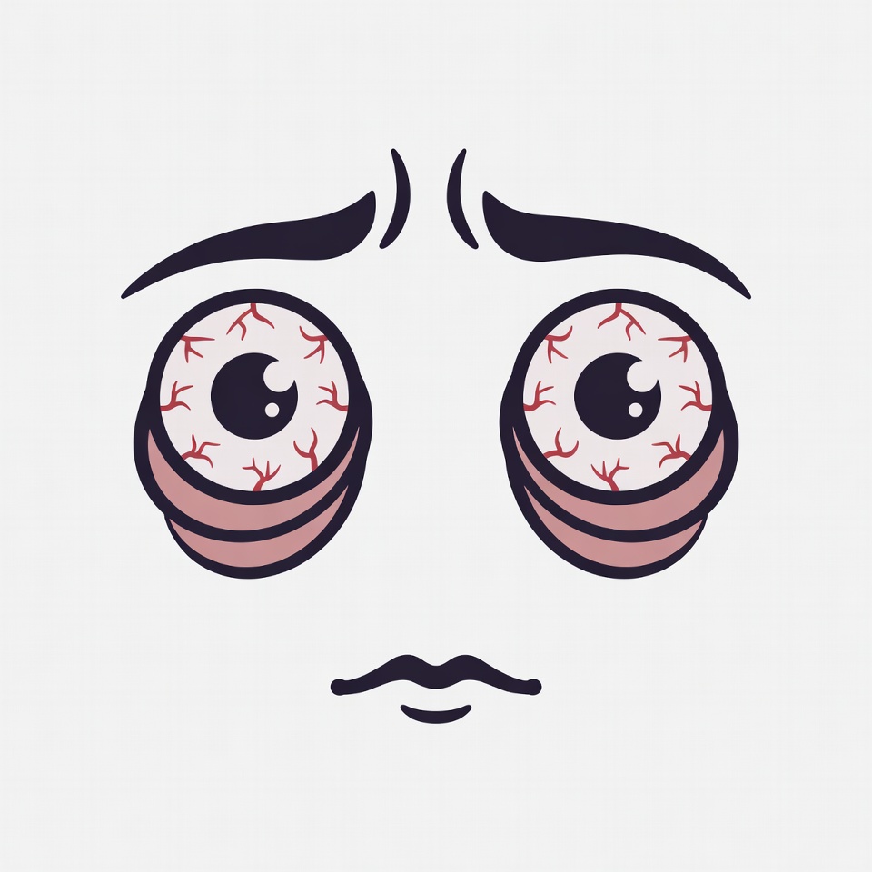bloodshot eyes, cartoon eyes, cartoon face, clipart, dark eyebrows, exhausted face, fatigue, illustration, isolated background, pink eyelids, red veins, sleepy, small mustache, vector art, wide eyes, tired eyes