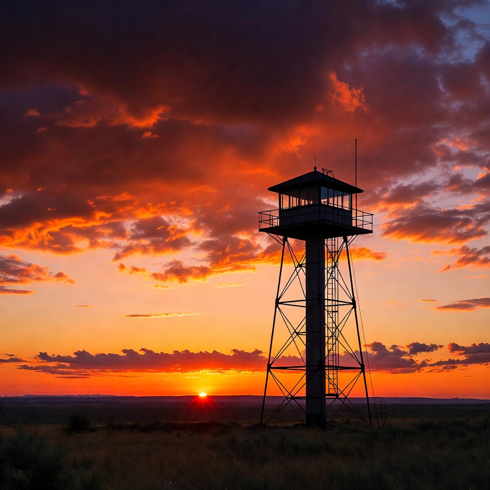 A tall metal guard tower stands silhouetted against a vibrant orange and purple sunset sky filled with dramatic clouds. The sun is low on the horizon, casting a warm glow over the surrounding grassy field. The tower features a small enclosed top with windows and an antenna.