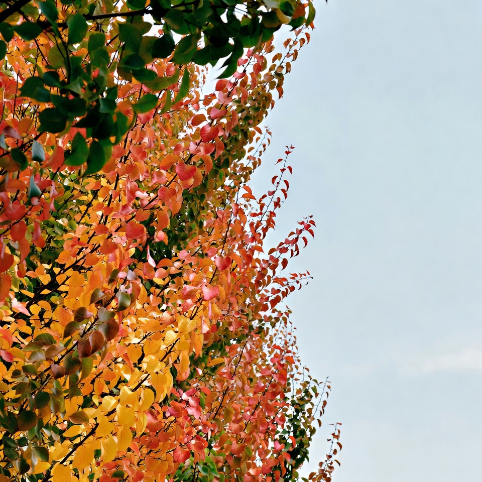 autumn colors, blue sky, colorful foliage, deciduous tree, fall leaves, fall tree, foliage, green leaves, leaf colors, nature, orange leaves, outdoor, red leaves, seasonal change, tree branches, vibrant leaves, yellow leaves, autumn tree