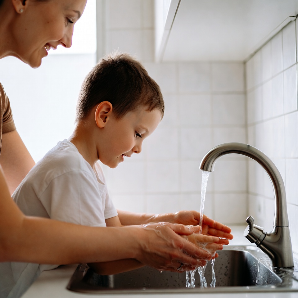 A smiling mother with light brown hair stands behind her young son in a kitchen sink area. The boy, with short brown hair and wearing a white t-shirt, washes his hands under running water from a silver faucet. She gently holds his hands under the stream of water in the white-tiled kitchen.