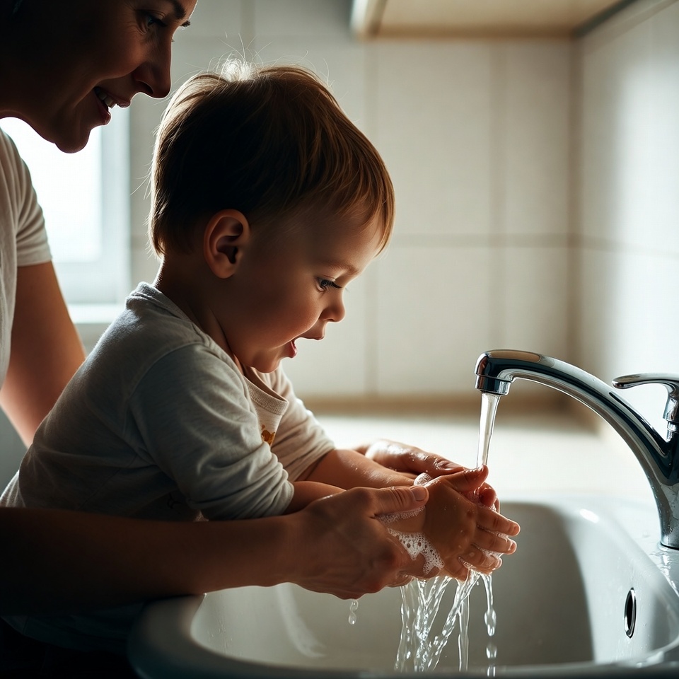 Mother helping toddler wash hands
