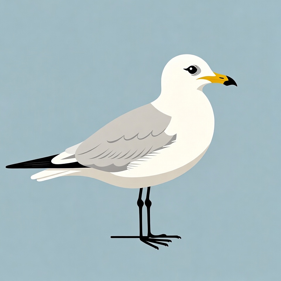 A simple cartoon illustration of a seagull stands on thin black legs against a solid light blue background. The bird features white and gray feathers, a yellow beak and eye ring, and black wing tips. It faces slightly to the right in a profile view.