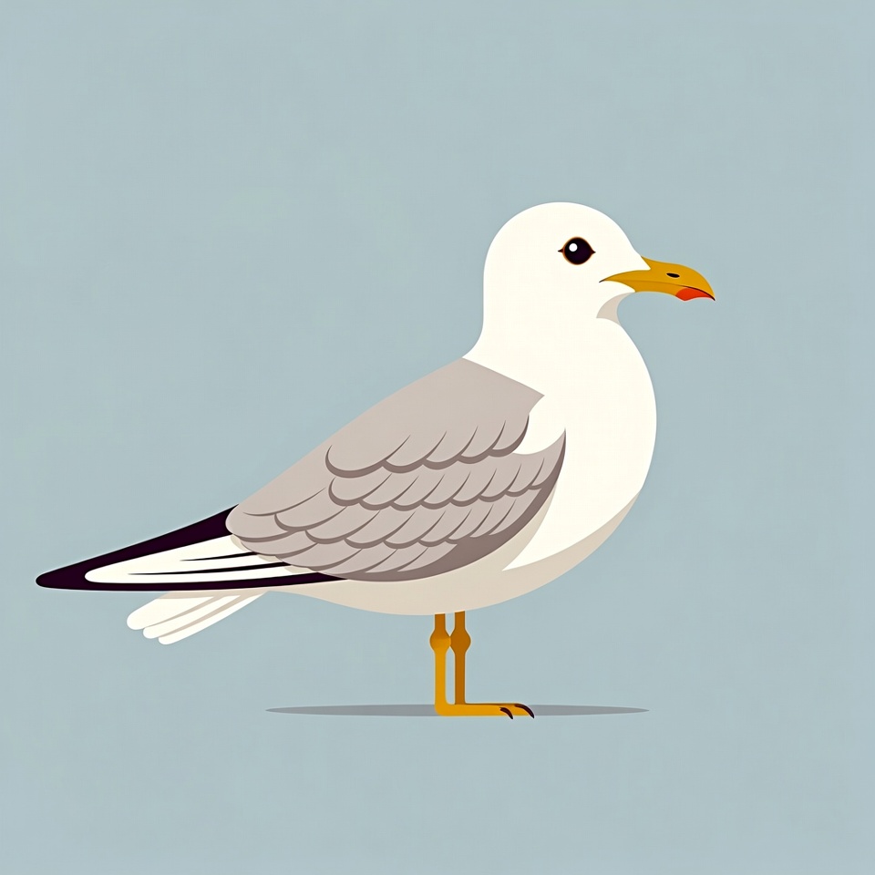 avian, bird, black eye, cartoon seagull, clipart, flat design, gray wings, gull, illustration, isolated background, orange legs, sea bird, simple illustration, vector art, white bird, wildlife, yellow beak, seagull