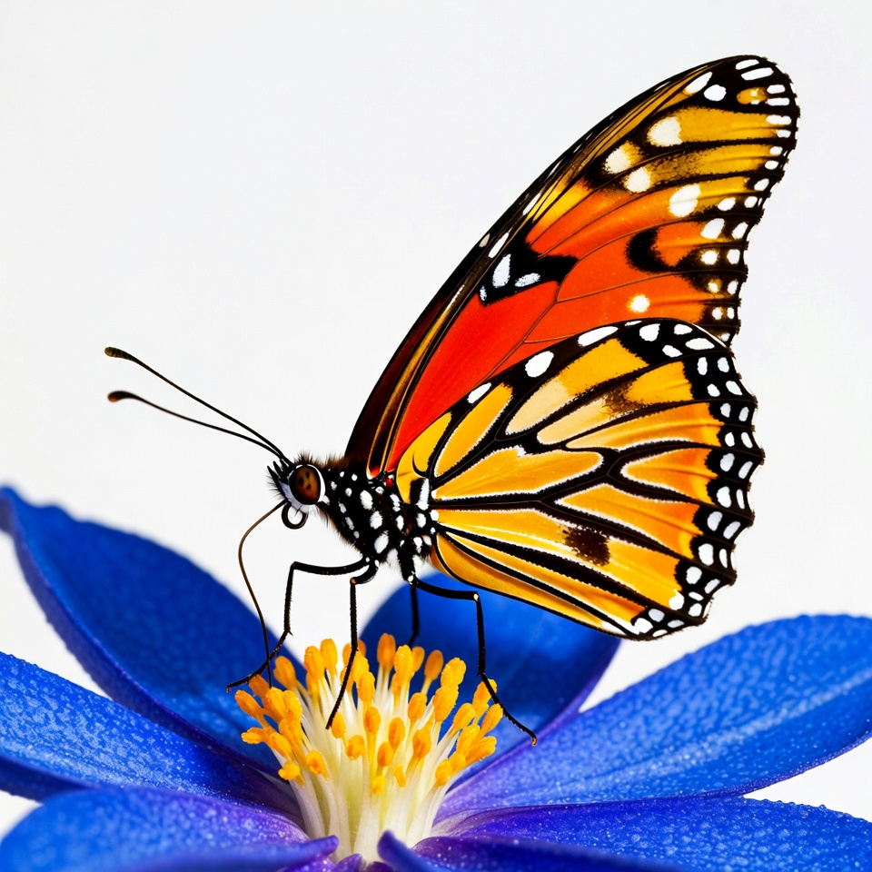 A vibrant monarch butterfly with orange, black, and white wings perches on a large blue flower. The butterfly's detailed patterns and antennae are clearly visible against the white background. The blue petals and yellow center of the flower provide a striking contrast.