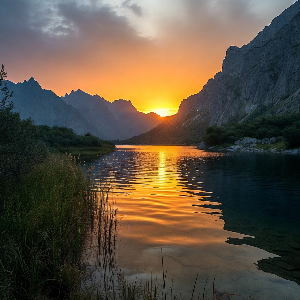 A vibrant sunset illuminates a serene lake nestled between towering rocky mountains. The sun's orange glow reflects beautifully on the calm water surface, surrounded by green reeds and distant peaks. Hazy clouds enhance the dramatic sky.