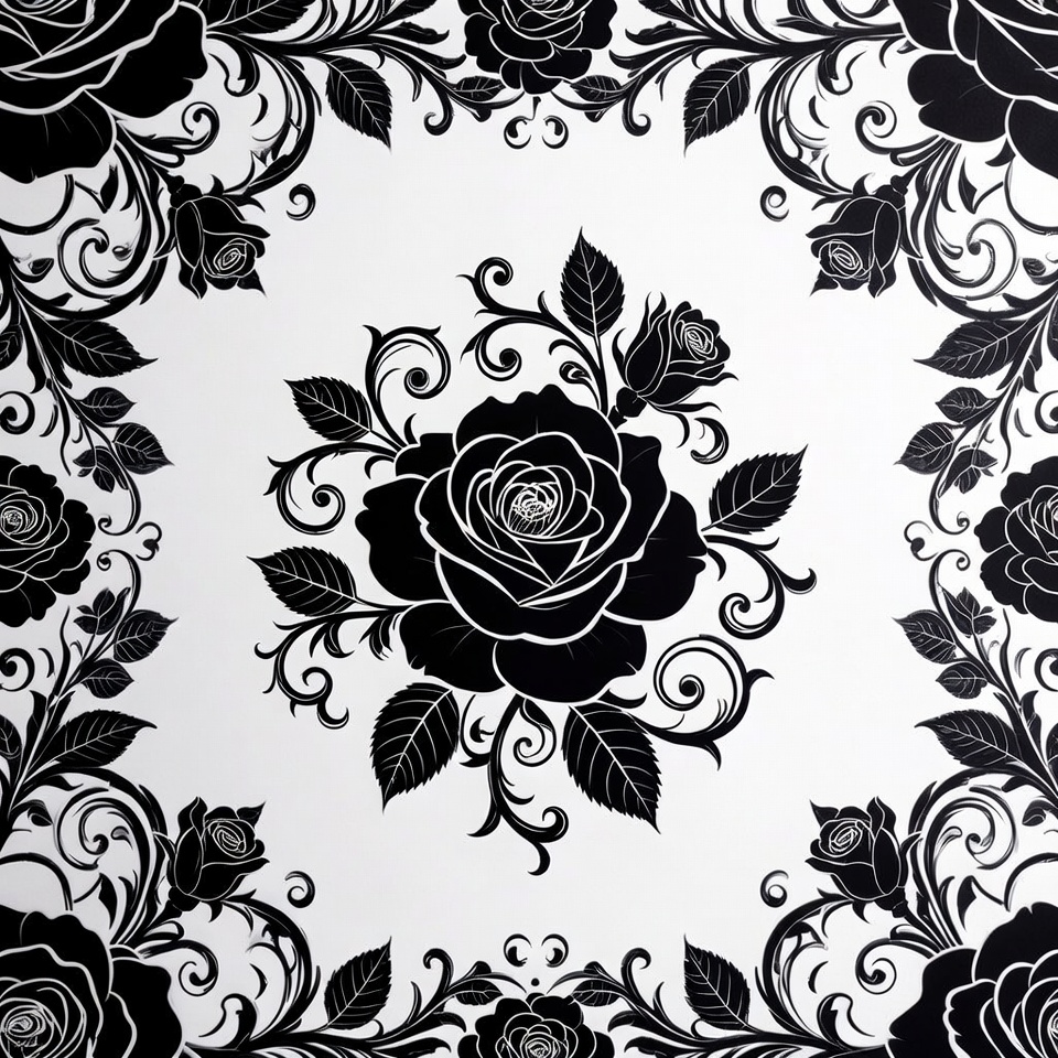 A square black and white illustration features intricate black roses and swirling vines forming an ornate border around a central large rose. The design uses bold silhouettes with detailed leaves and petals on a clean white background. The pattern is symmetrical and decorative.