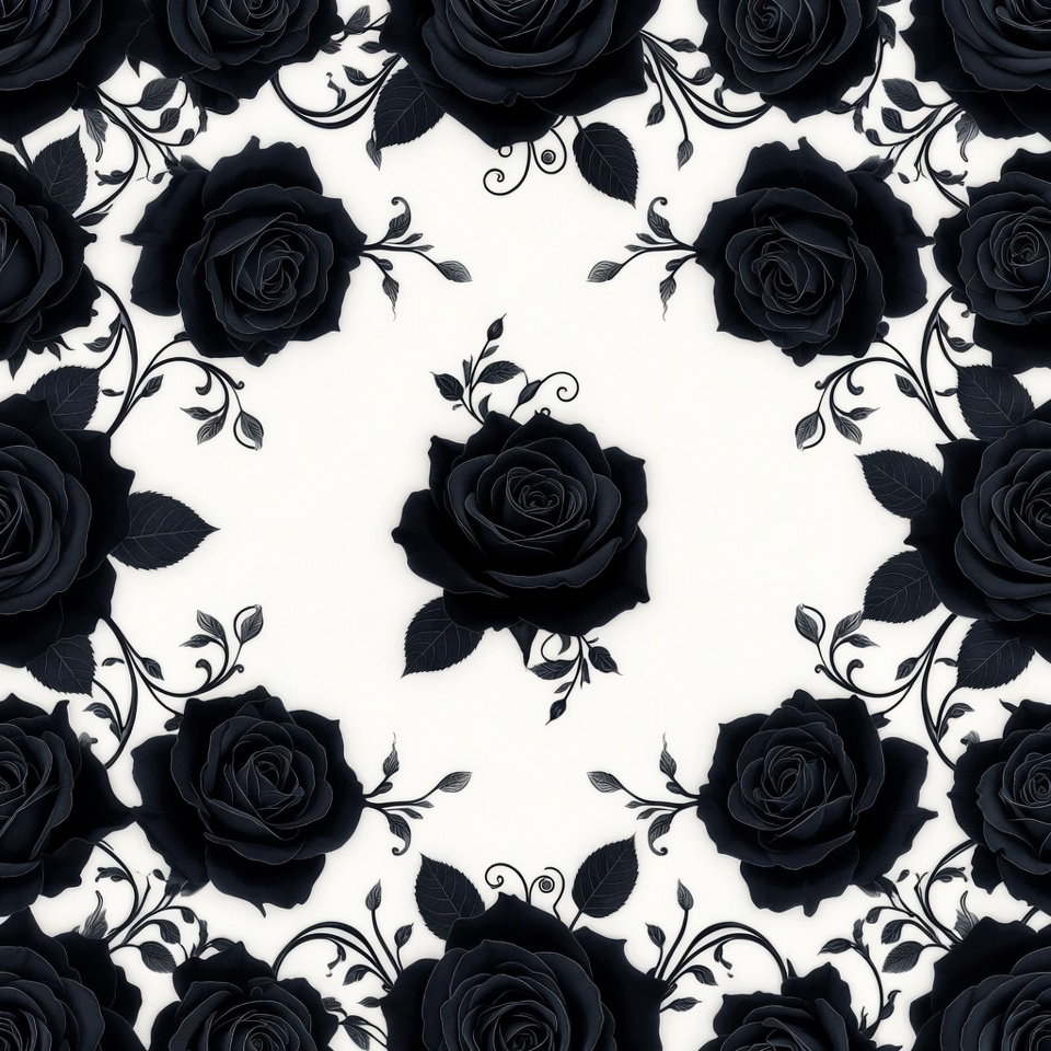 A seamless pattern features multiple black roses with stems and leaves arranged symmetrically on a white background. The roses are detailed in a dark silhouette style with intricate petal and leaf outlines. The design repeats continuously for use as wallpaper or fabric.