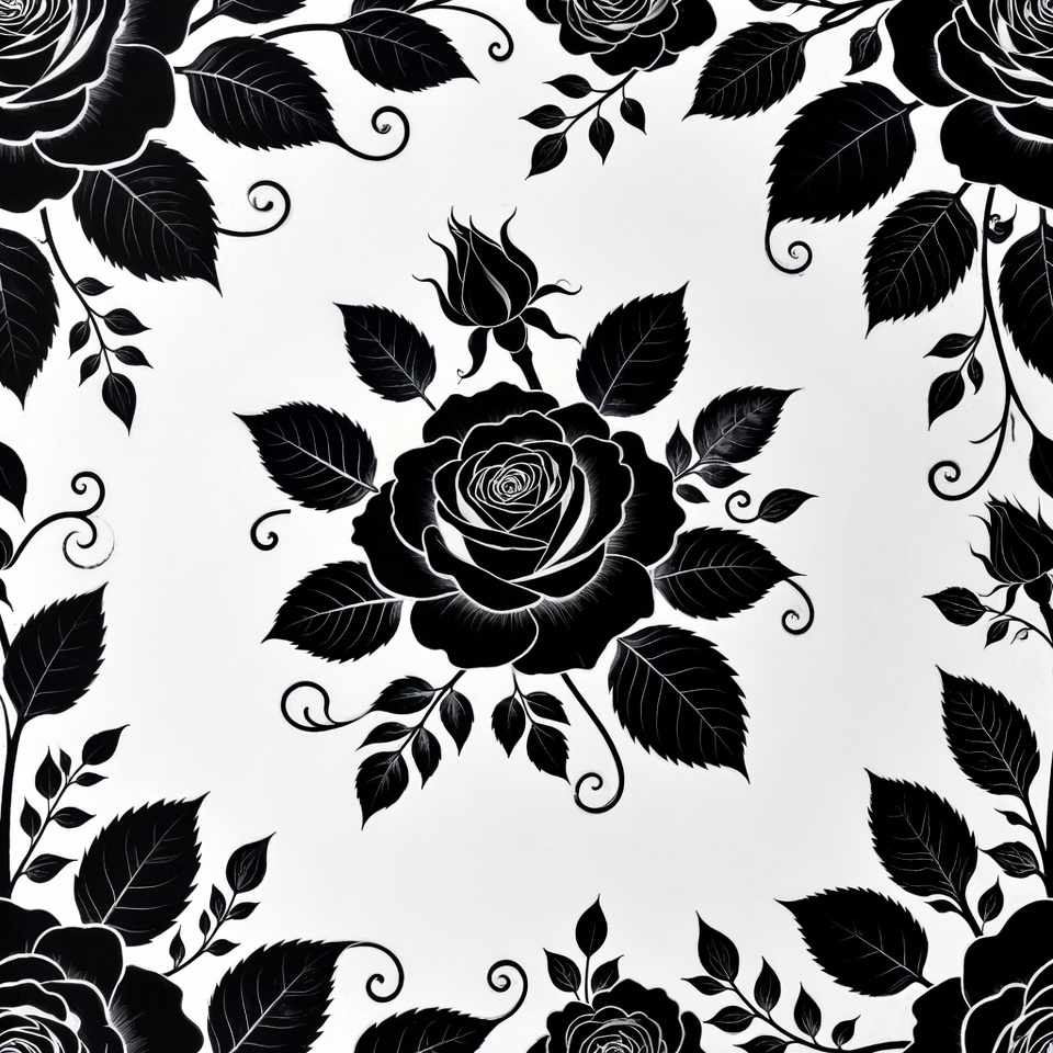 A seamless pattern features intricate black roses and leaves on a white background. The design includes blooming roses, buds, and swirling stems arranged symmetrically. It is rendered in a detailed silhouette style suitable for backgrounds or textures.