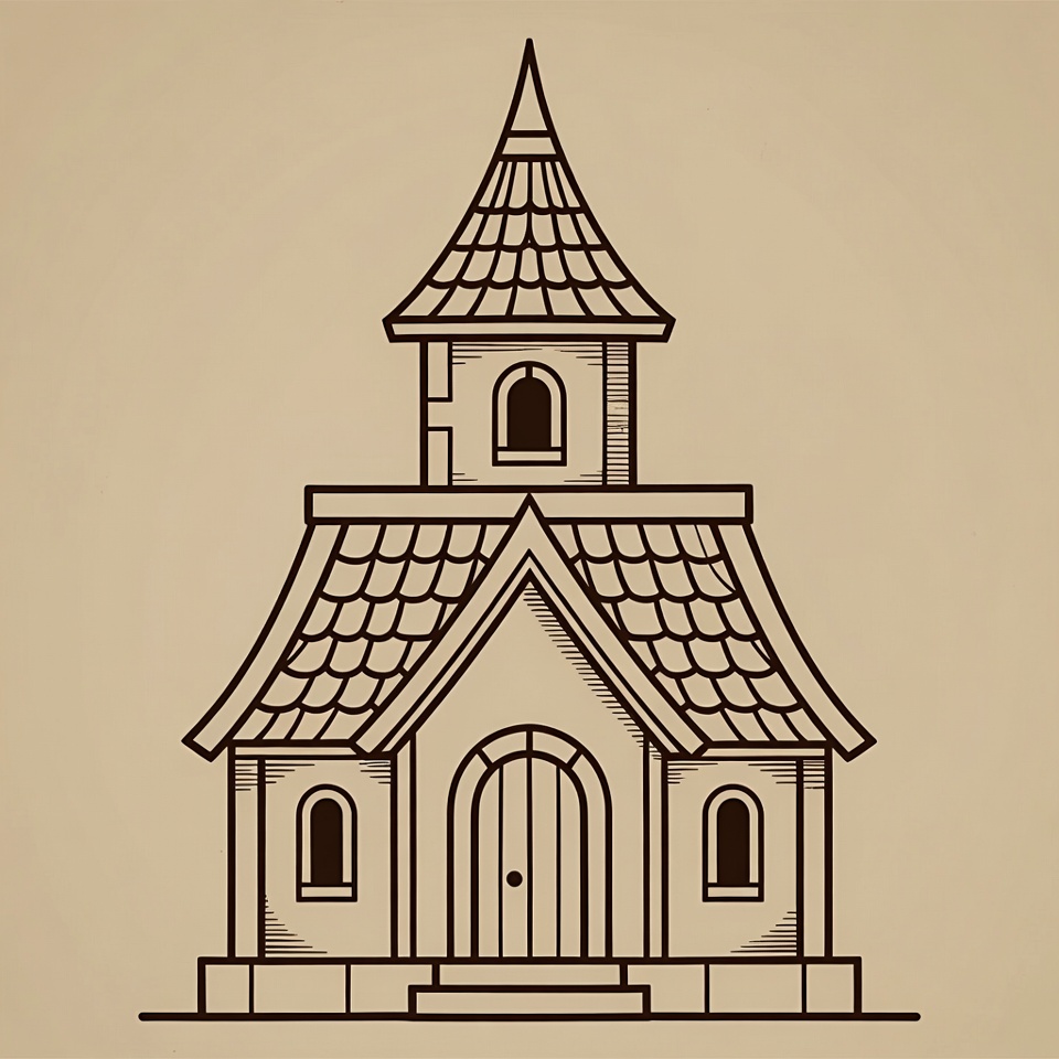 A detailed line drawing of a quaint church with a tall pointed steeple and tiled roof. The illustration features arched windows, a prominent wooden door, and stone base on an isolated beige background. The style is vintage line art with intricate hatching.