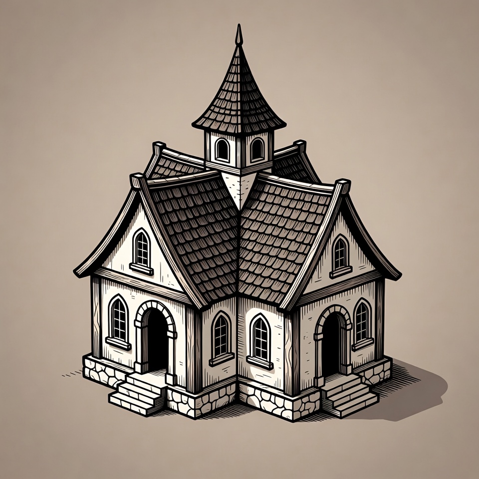 A detailed line art illustration of a small medieval church with a tall steeple and tiled roofs. The building features arched windows, wooden doors, and stone steps on an isolated beige background. It has a three-dimensional isometric view with intricate ink shading.