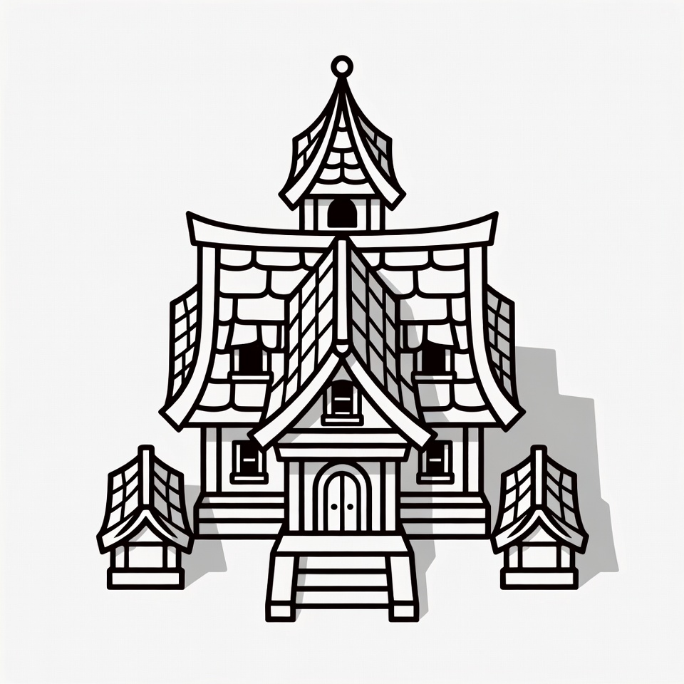 A detailed black line art illustration of a tall haunted mansion with multiple steep roofs and towers. The gothic-style house features arched windows, a central front door with steps, and decorative gables on an isolated white background. Shadows beneath the structure add depth to the drawing.