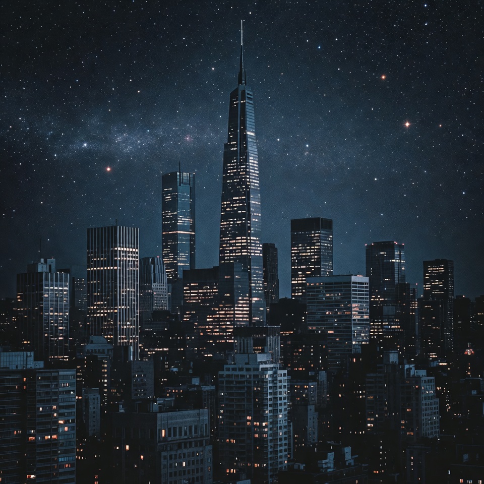 Milky Way, Transamerica Pyramid, astronomy, blue tones, city lights, cityscape, cosmic background, dark sky, galaxy, iconic pyramid, lit windows, modern architecture, night sky, nighttime city, skyscrapers, starry night, stars, tall buildings, urban landscape, San Francisco skyline