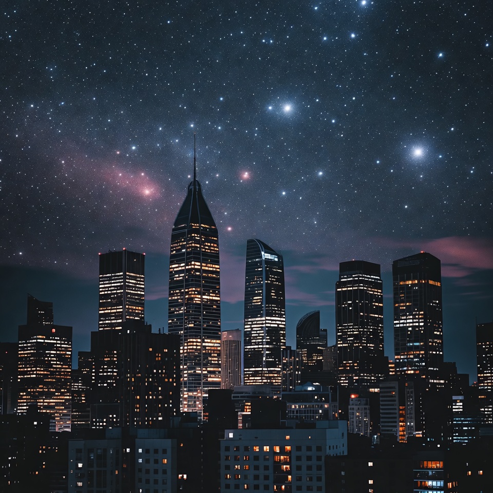 astronomy, building lights, celestial view, cityscape, dark sky, futuristic city, glowing lights, high rise, illuminated towers, metropolis, modern buildings, nebulae, night city, night sky, nightscape, pink clouds, purple hues, skyscrapers, starlit sky, starry night, stars, tall buildings, urban lights, urban night, city skyline