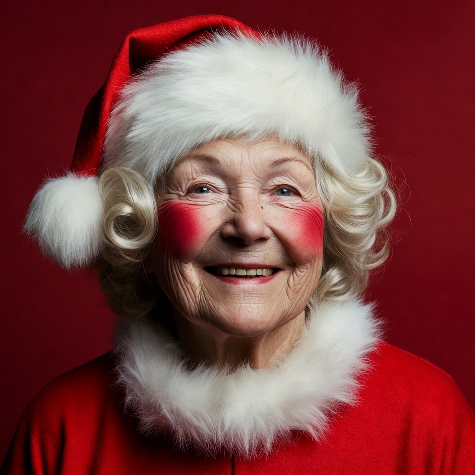 An elderly White woman with curly white hair and rosy cheeks smiles happily while wearing a fluffy red Santa hat and red Santa costume. She has a white fur-trimmed collar around her neck and stands against a solid red background. Her eyes are bright and expressive, with heavy makeup enhancing her joyful expression.