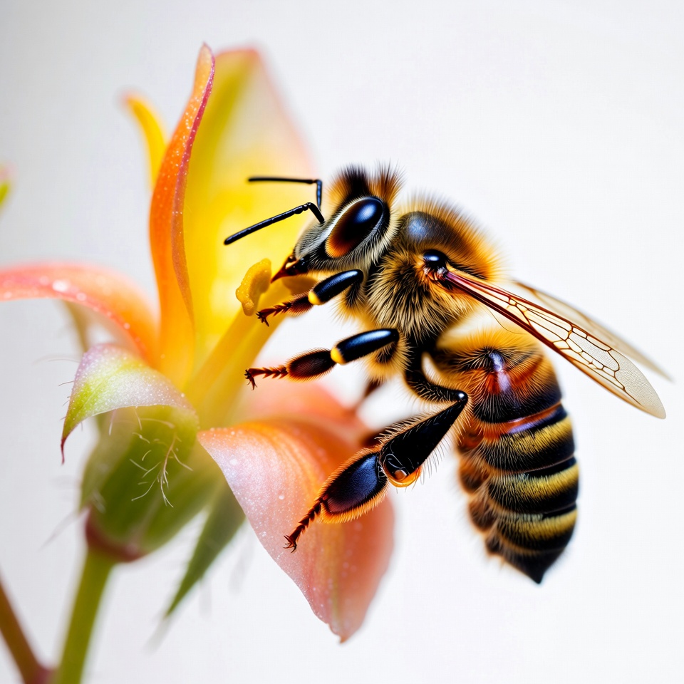arthropod, bee, closeup, detailed bee, floral, flower pollen, flying insect, honey bee, insect, macro, nature, nectar, orange flower, petals, pollination, stripes, vibrant flower, white background, wildlife, wings, honeybee