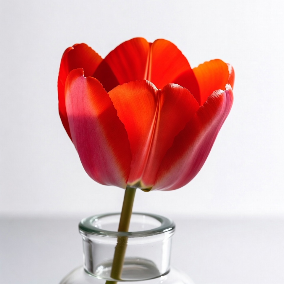 blooming tulip, closeup flower, cut flower, floral arrangement, flower vase, fresh tulip, glass vase, green stem, isolated background, scarlet petals, spring flower, tulip flower, vibrant red, white background, red tulip