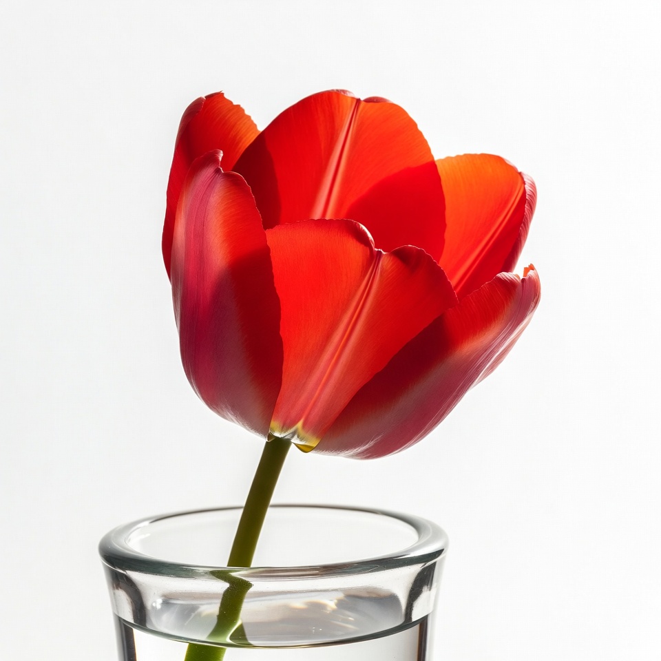 bloom, closeup, floral, flower, fresh flower, glass vase, isolated background, nature, petals, plant, red flower, stem, tulip, vibrant red, water vase, white background, red tulip