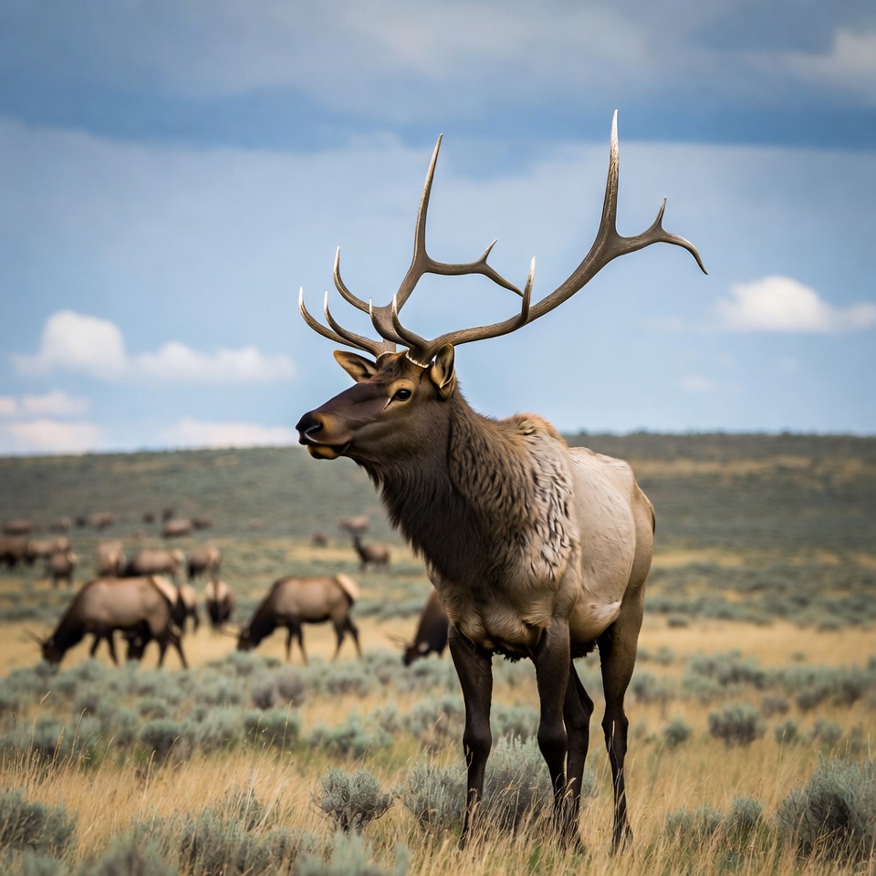 animal, antlers, brown fur, bull elk, clouds, distant elk, field, grassland, herd, large antlers, majestic elk, meadow, nature, north america, outdoors, rocky mountains, rutting season, sagebrush, sky, standing elk, wapiti, wild animal, wildlife, elk
