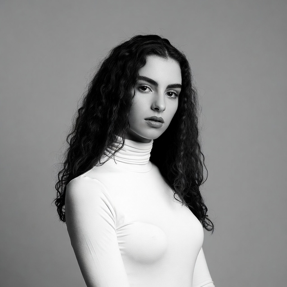 A young woman with long curly black hair stands against a gray background in a black and white photo. She wears a fitted white turtleneck sweater and gazes slightly to the side with a subtle expression. Her hair cascades over her shoulders.