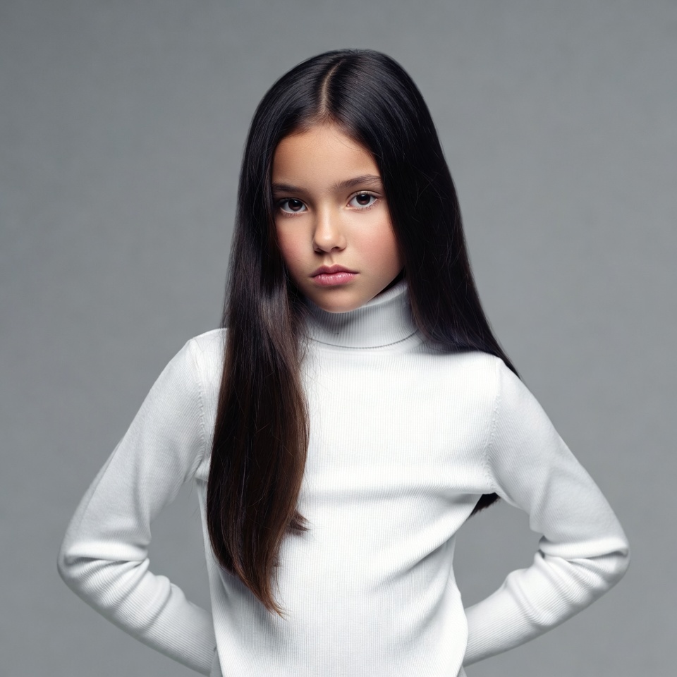 A young girl with straight long black hair stands against a gray background. She wears a white turtleneck sweater and has her arms crossed. Her expression is neutral with large dark eyes.