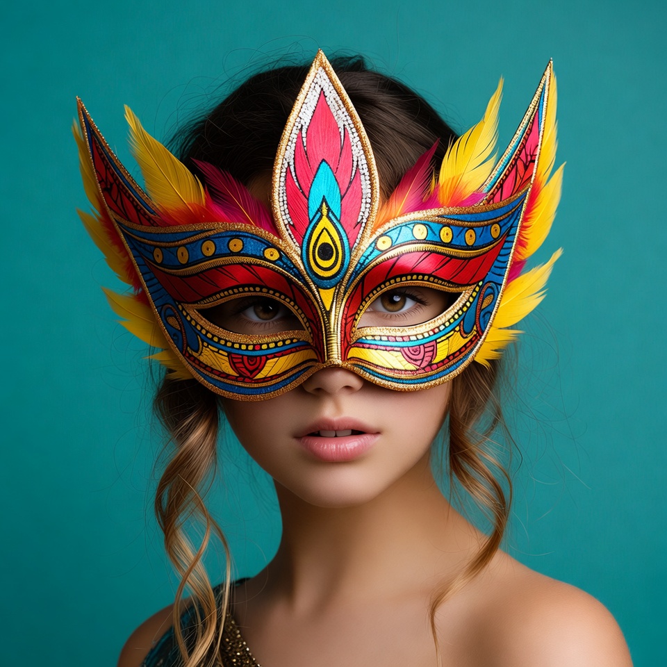 A young girl with brown wavy hair wears an elaborate multicolored Venetian-style mask adorned with red, yellow, and blue feathers. The mask features intricate gold patterns and covers her eyes, leaving her lips and nose visible. She poses against a solid turquoise background.