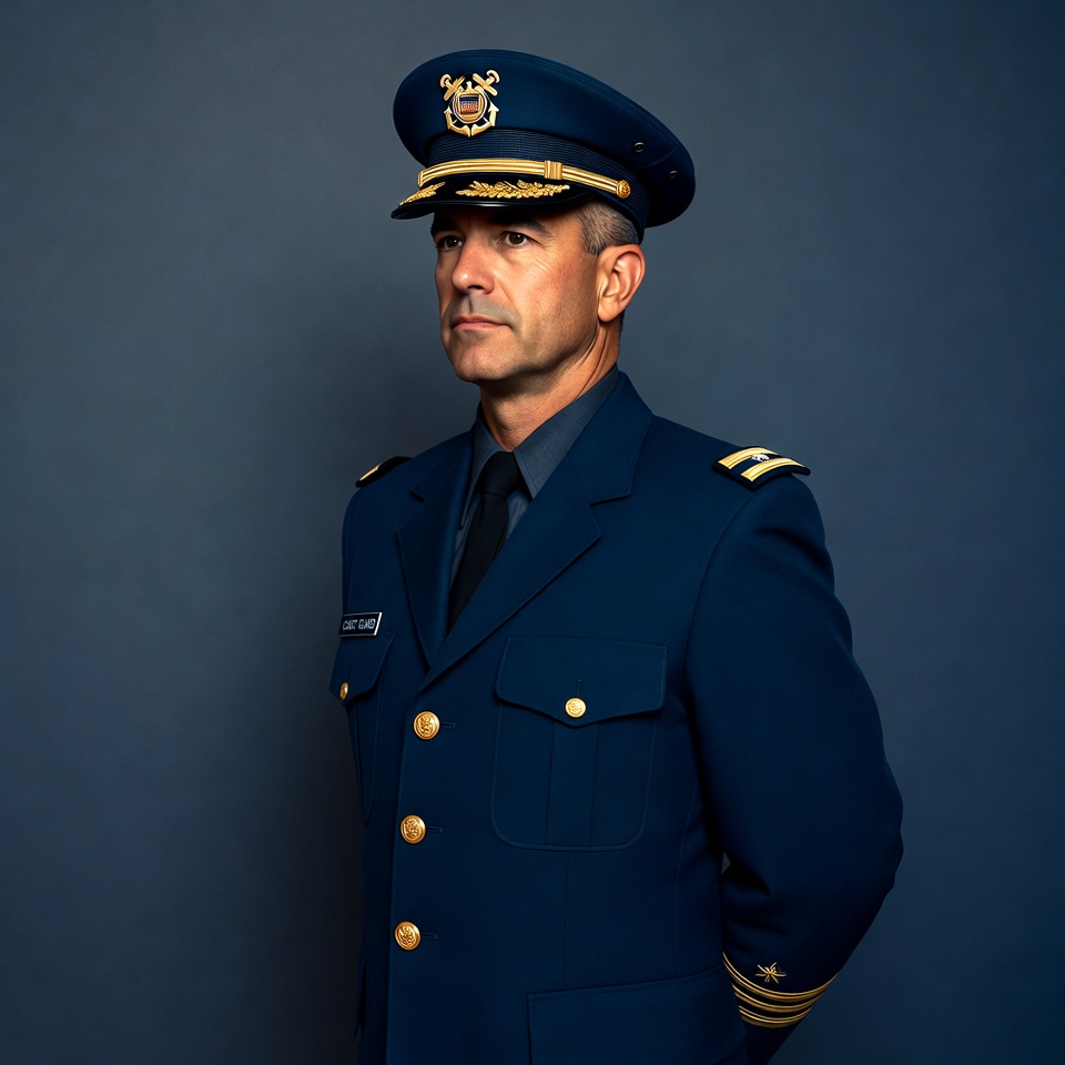 A man with short hair and a serious expression wears a navy blue captain's uniform with gold braid on the peaked cap and epaulets. He stands in a side profile against a plain dark blue background. The uniform features a name tag, black tie, and decorative buttons.
