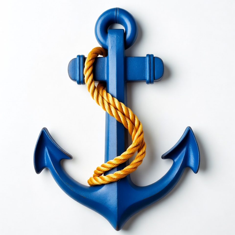 blue anchor, crossbar, flukes, isolated background, maritime, nautical, navy blue, ocean symbol, rope, sailing, ship anchor, thick rope, white background, wooden anchor, yellow rope, anchor