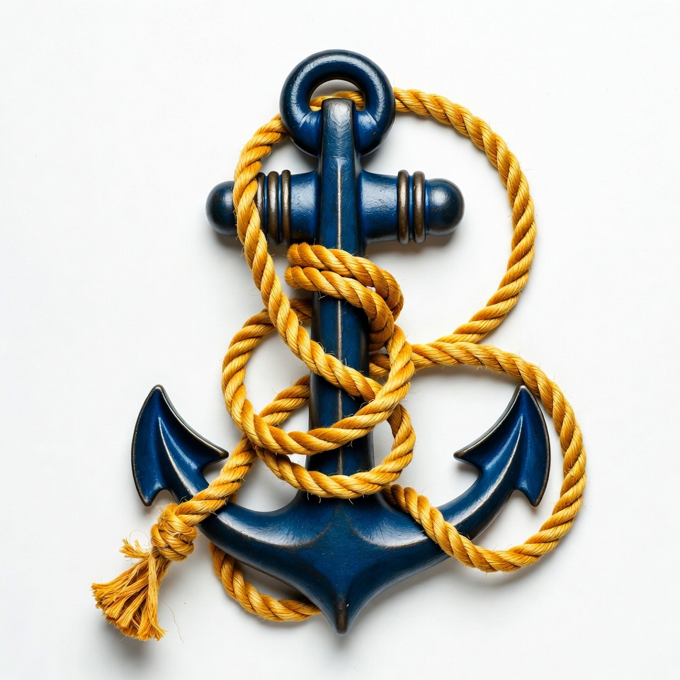 A detailed navy blue anchor is wrapped with thick yellow rope on a white background. The anchor features pointed flukes and a prominent ring at the top. The rope loops around the shank and arms, creating an intricate nautical design.