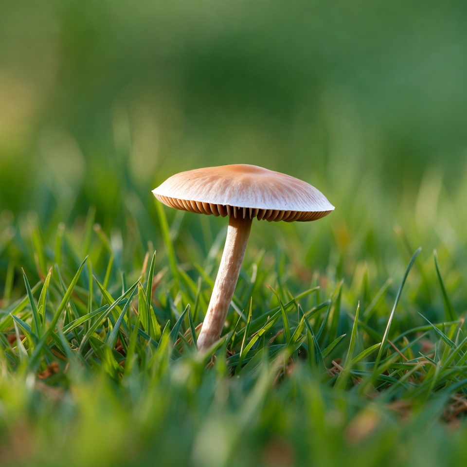 brown mushroom, forest floor, fungus, grass, green grass, macro, mushroom cap, mushroom stem, natural habitat, nature, outdoor, single mushroom, tan cap, white gills, wild mushroom, mushroom