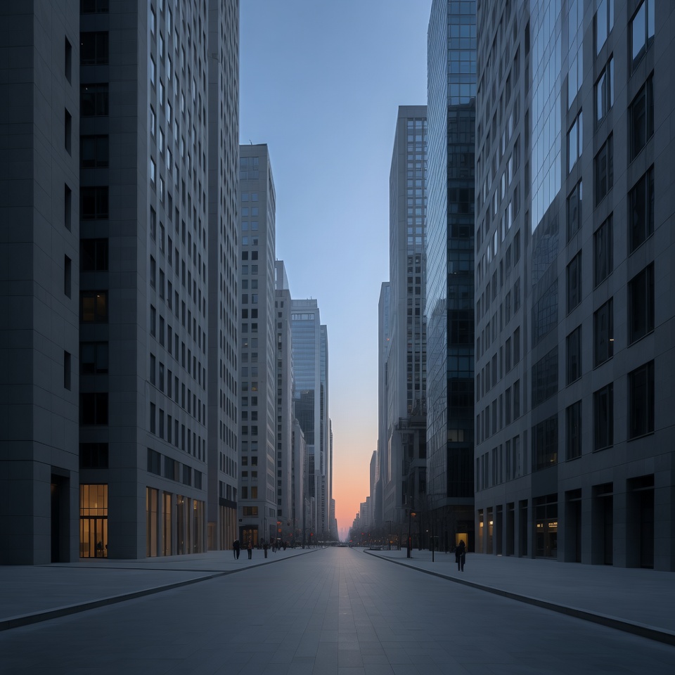 A wide, empty street lined with tall modern skyscrapers stretches into the distance under a twilight sky. The buildings feature glass and concrete facades reflecting hues of blue and orange from the sunset. A few distant streetlights illuminate the deserted urban scene.