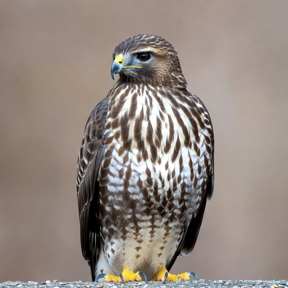 A red-tailed hawk stands on a rock with its wings slightly folded. The bird features brown plumage with white underparts streaked in dark bands, a yellow beak, and piercing yellow eyes. It faces slightly to the side against a blurred neutral background.