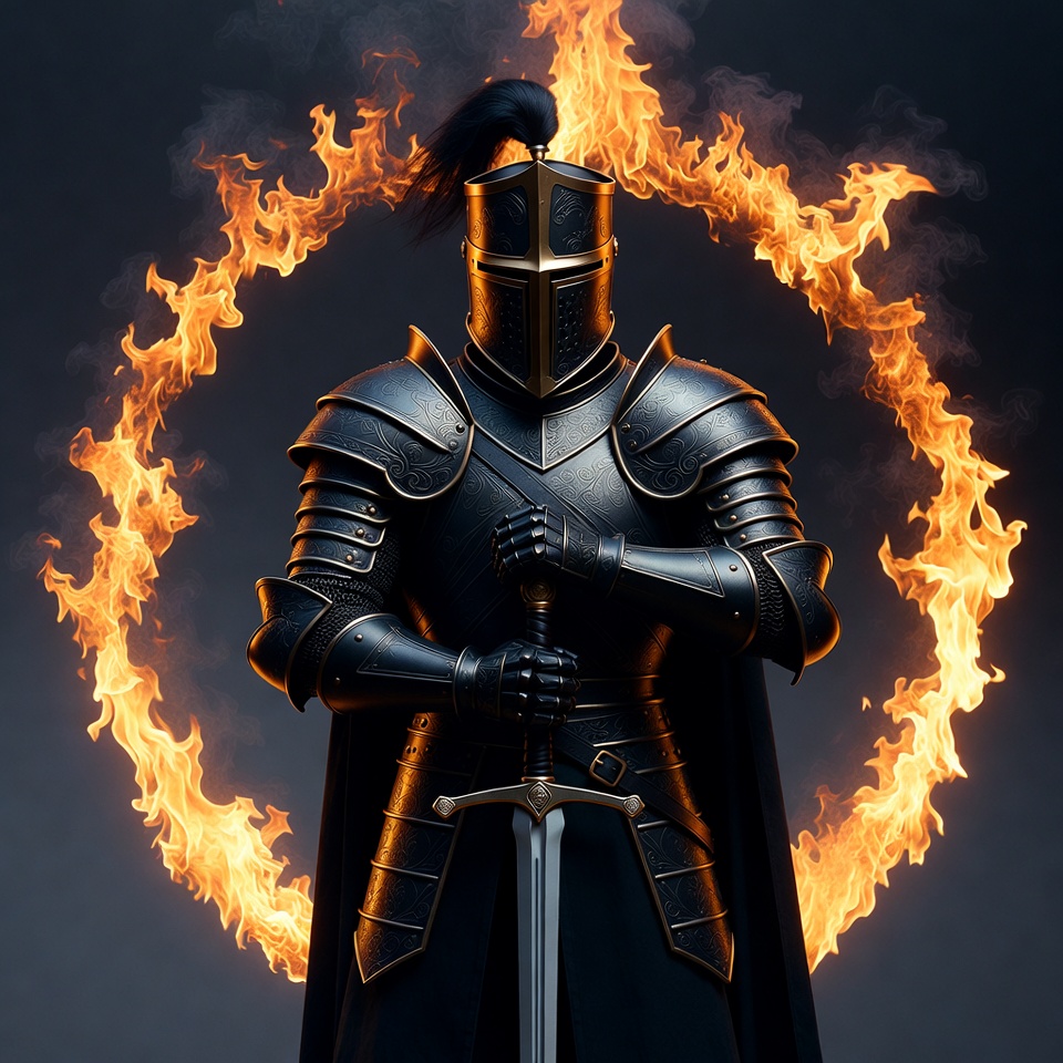 Knight in Armor with Sword in Fire Circle