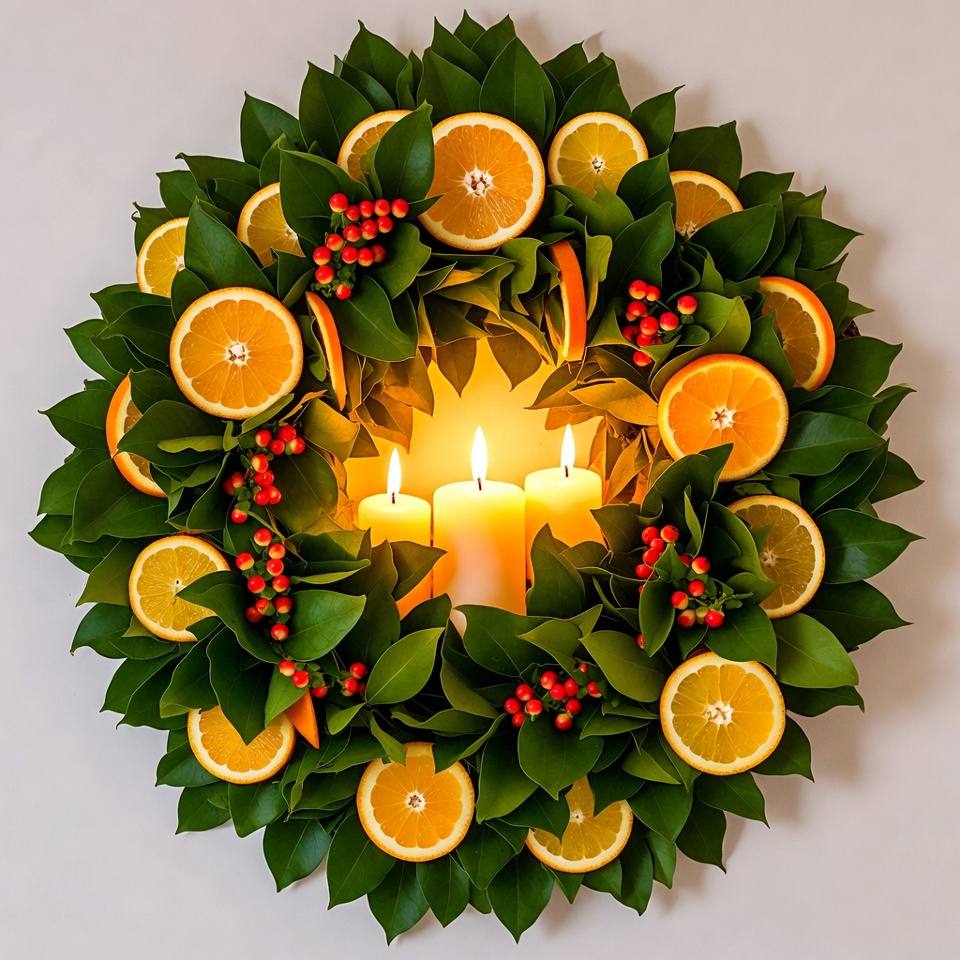 A circular holiday wreath features lush green leaves, vibrant orange slices, and red berries arranged symmetrically. Three white pillar candles with glowing flames are centered in the wreath. The wreath is displayed against a plain white background.