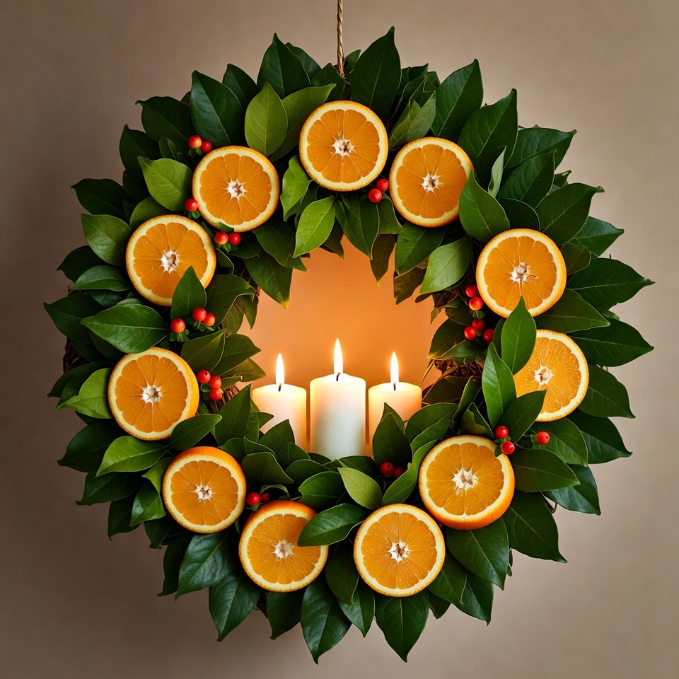 Christmas decor, berry accents, circular wreath, evergreen leaves, festive wreath, fresh oranges, fruit wreath, green leaves, hanging wreath, holiday decoration, holiday wreath, lit candles, orange slices, oranges, pillar candles, red berries, warm glow, white candles, wreath, Christmas wreath