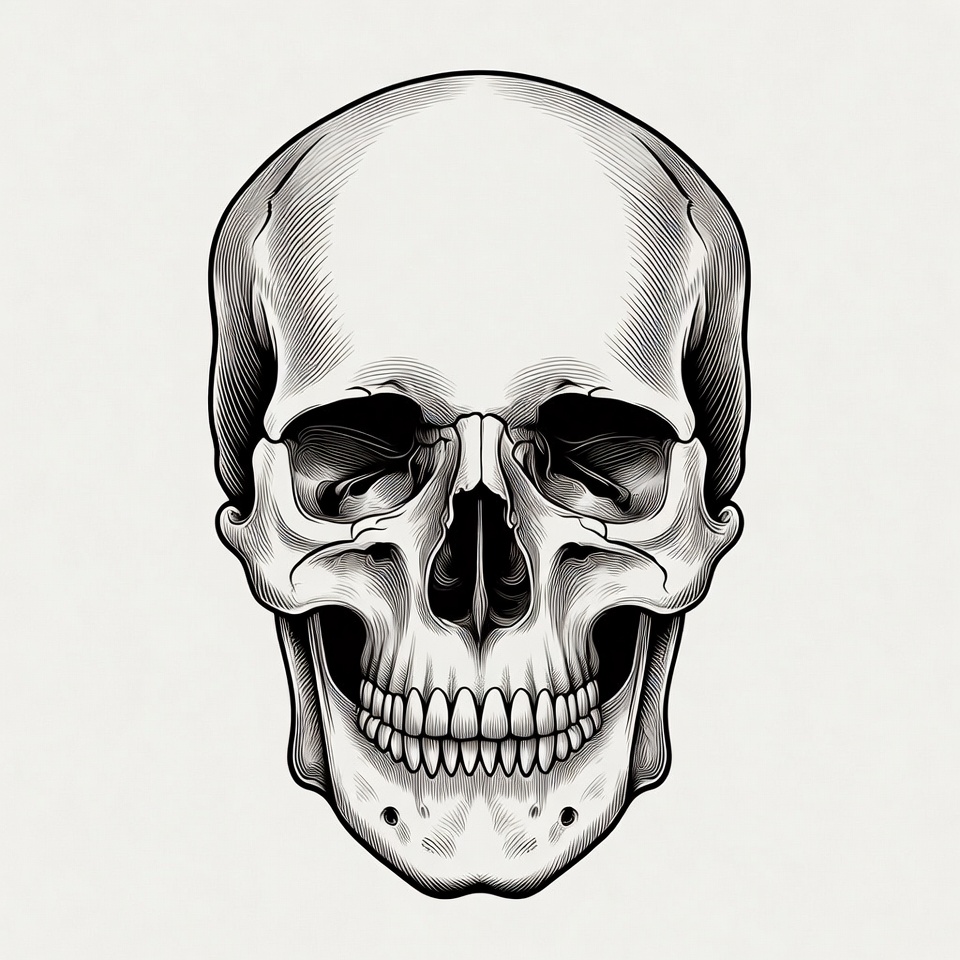 Halloween, anatomy, cranium, death symbol, drawing, eye sockets, front view, gothic, human skull, illustration, ink art, isolated background, jawbone, line art, skeleton, tattoo design, teeth, white background, skull