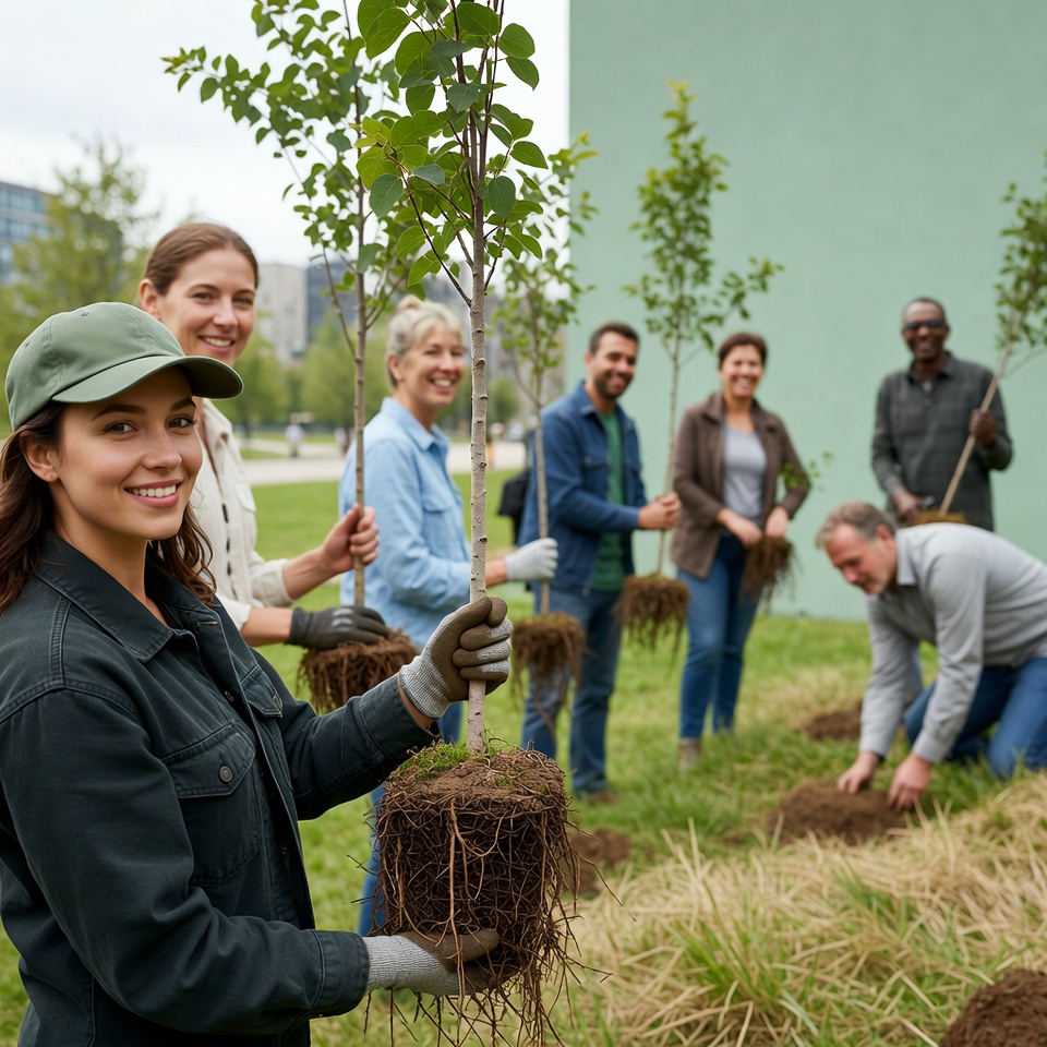 A diverse group of men and women plants young trees with exposed roots in a grassy park area. They wear casual outdoor clothing and gloves while holding saplings and digging soil near a green wall and urban background. Several trees are already positioned in the ground as they work together.