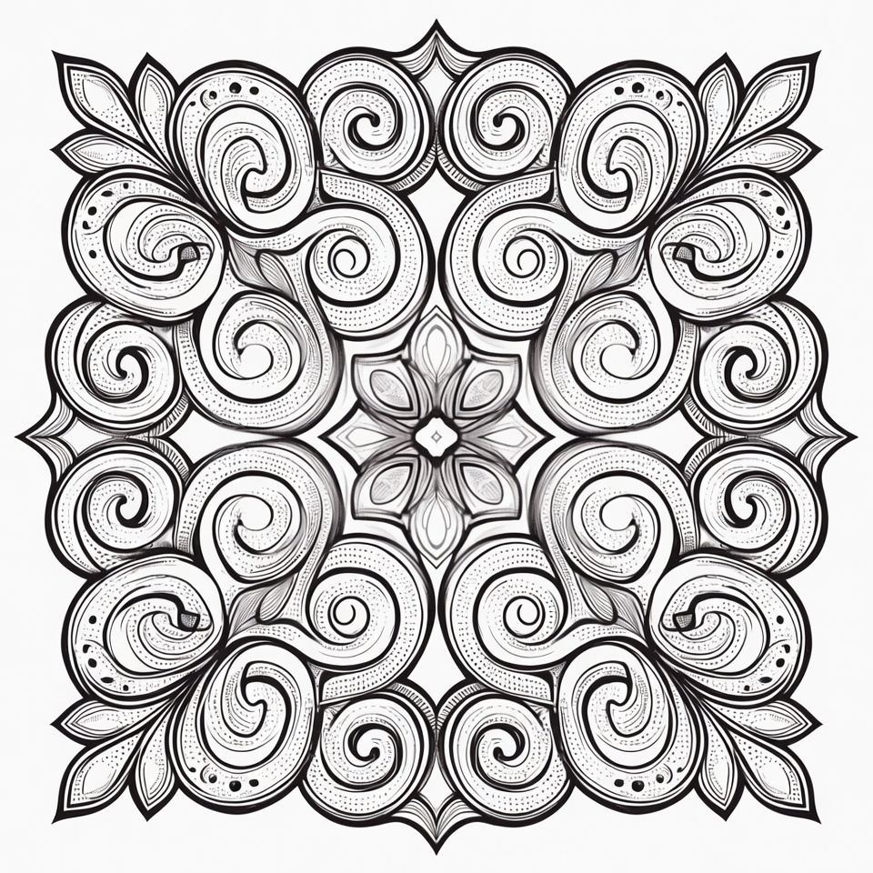 artistic ornament, black line art, clipart, decorative border, doodle, floral mandala, flower center, illustration, ink drawing, intricate pattern, isolated background, leaf motif, ornate design, square frame, swirl pattern, symmetrical art, vector graphic, vine design, zentangle, mandala