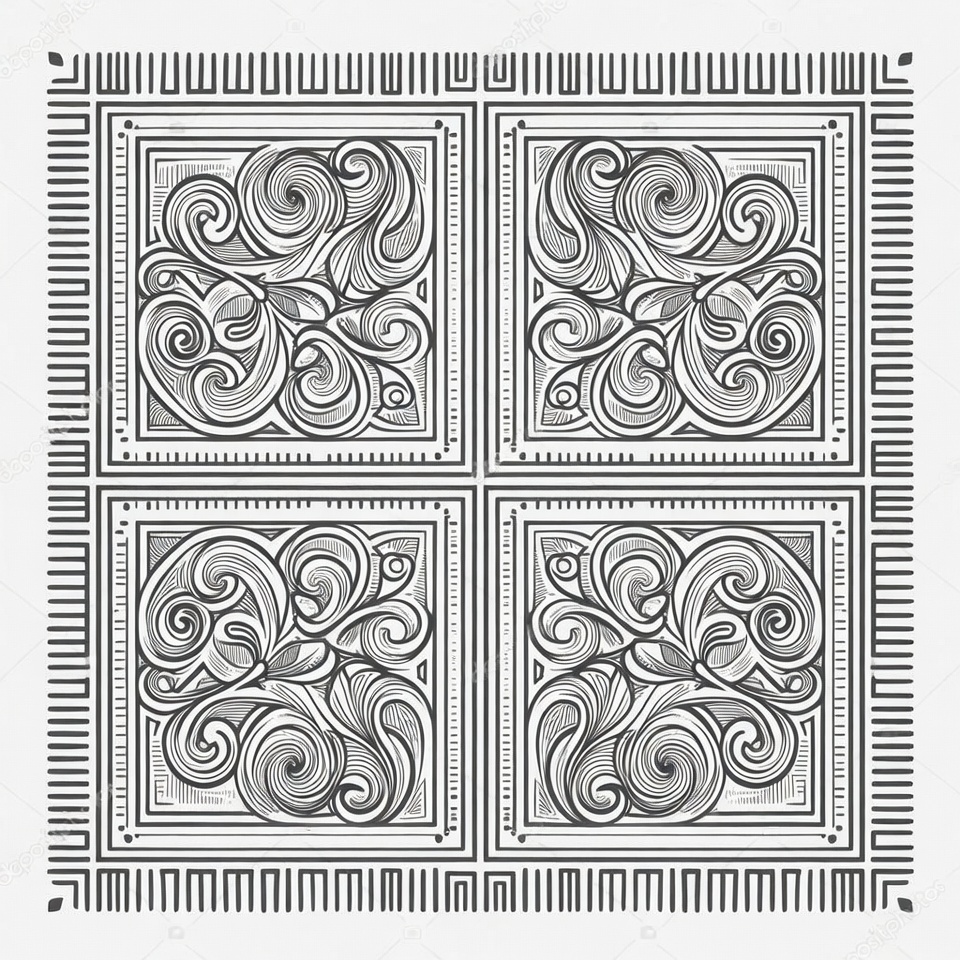 A symmetrical vector illustration features intricate swirling floral and vine patterns in grayscale. The design is divided into four quadrants within a thick geometric frame on an isolated white background. Each section contains elaborate curls and leaves forming a decorative border.
