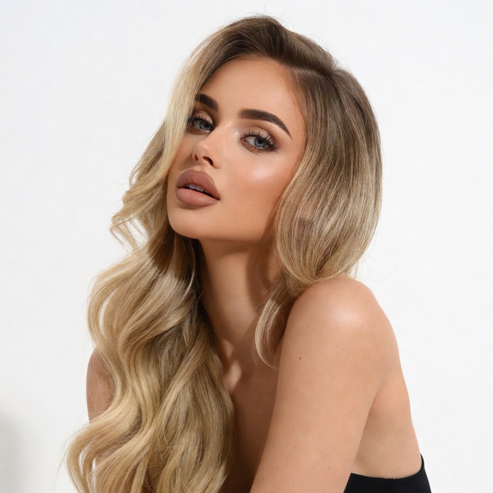A young woman with long wavy blonde hair poses with her head turned to the side against a white background. She has striking blue eyes, full lips with glossy lipstick, and flawless makeup highlighting her features. She wears a black top and gazes confidently at the camera.