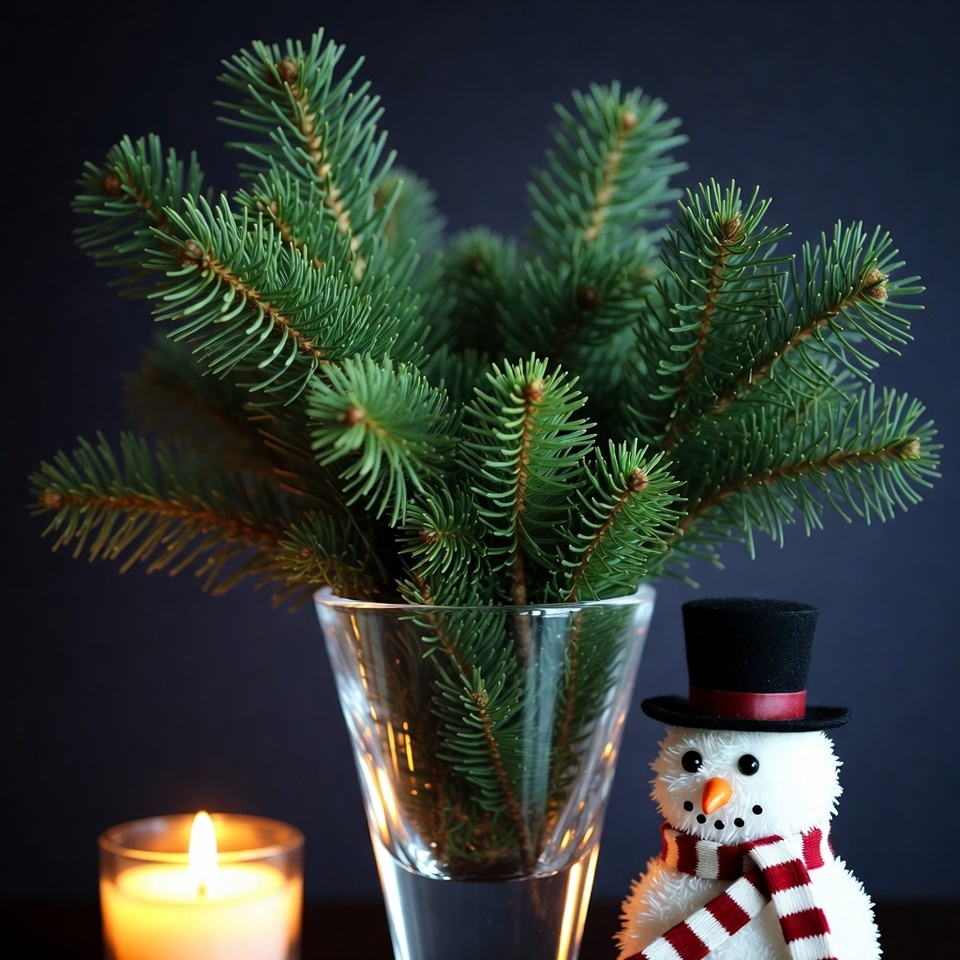 A clear glass vase holds lush green fir branches on a dark background. A small white snowman figurine with black top hat and red scarf stands beside the vase. A lit candle glows nearby, adding warm light to the holiday display.