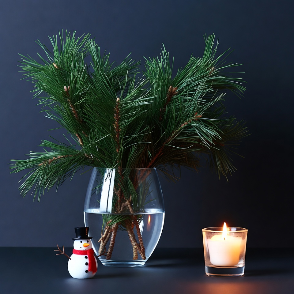 Fresh green pine branches are arranged in a tall clear glass vase filled with water. A small white snowman figure with a red scarf and black hat sits beside the vase on a dark blue background. A lit white candle in a glass holder is positioned next to them.