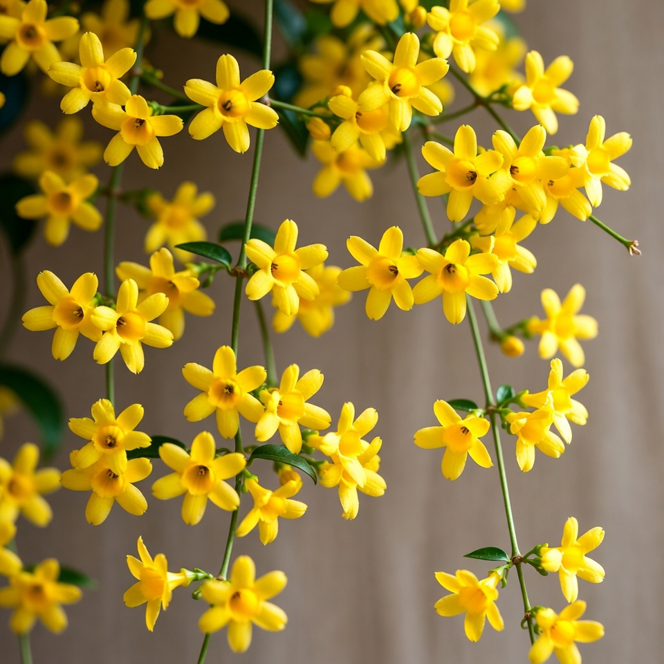A dense cluster of small yellow flowers hangs gracefully from green vines against a light wooden background. Each flower features five bright yellow petals and a darker yellow center. The vines and leaves add a natural trailing effect to the vibrant floral display.