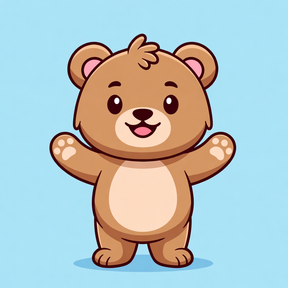 A cute brown teddy bear illustration stands on a light blue background with arms raised wide open. The bear has big sparkling eyes, a happy smile, and fluffy fur details. It features paw pads on its hands and feet in a playful cartoon style.
