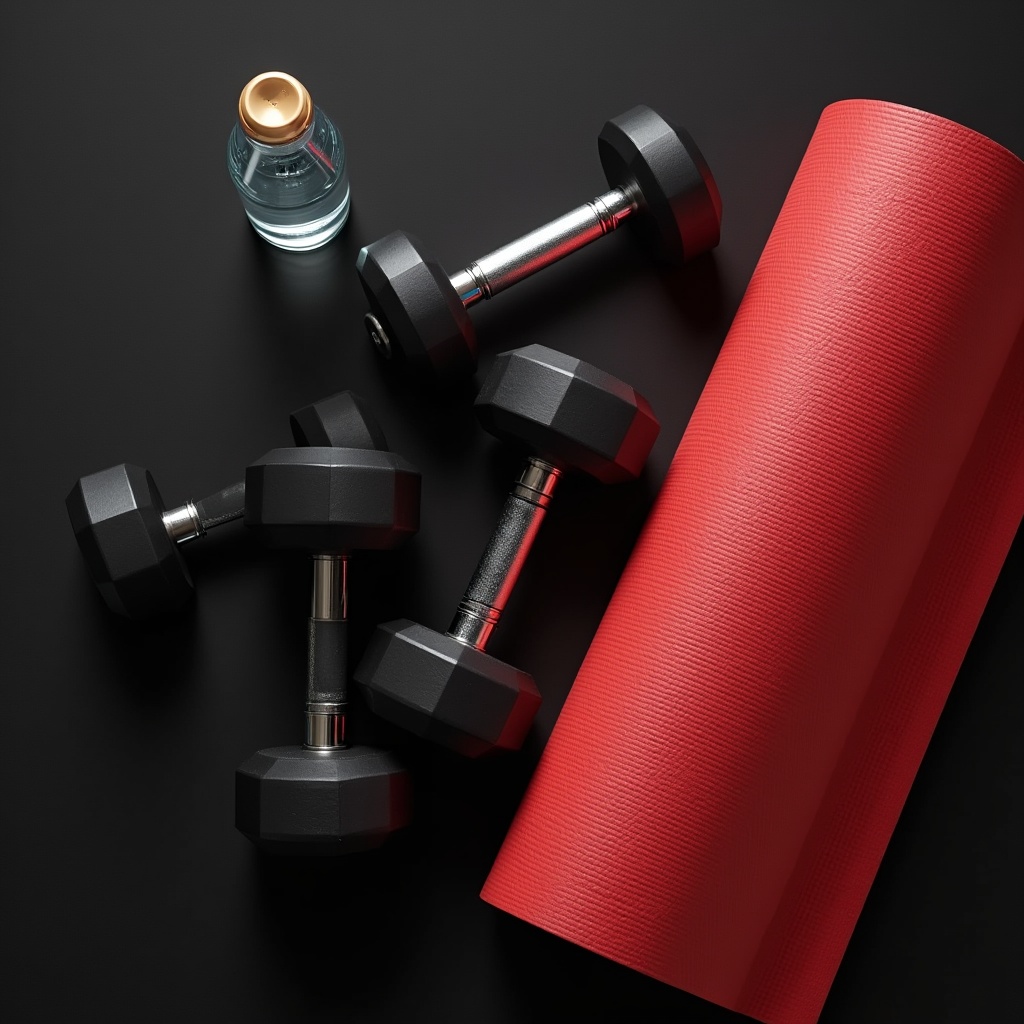 athletic equipment, black background, exercise tools, fitness equipment, fitness props, flat lay, gym essentials, gym gear, home gym, hydration bottle, red mat, sports gear, strength training, water bottle, weightlifting, weights, workout accessories, yoga accessories, yoga mat, dumbbells
